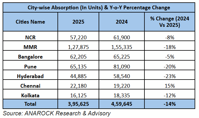 ANAROCK Research data indicates that housing sales in the top 7 cities witnessed a 14% decline in 2025, with approx. 3,95,625 units sold in the year against 4,59,645 units in 2024.