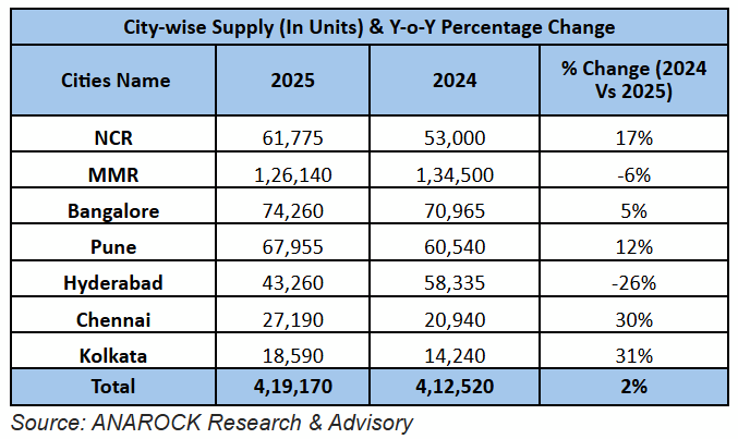 New launches in the top 7 cities saw a 2% annual increase – from approx. 4,12,520 units in 2024 to approx. 4,19,170 units in 2025.